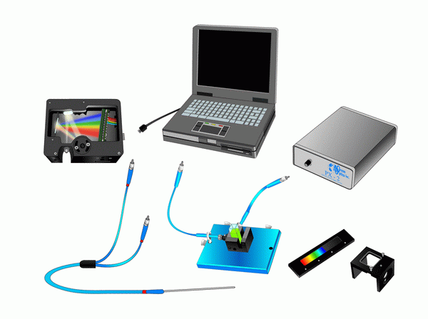 系统需要两根光纤,其中一根用于照明,一根用于读取数据。一个特别设计的CUV-ALL-UV样品支架,这个支架可以用于吸收测量,当光纤90度连接的时候,就可以用于荧光测量,同时配上两个荧光反光镜,可以有效的提高荧光效率。