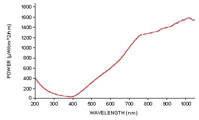 复合光栅和滤光片 HR4000CG光谱仪使用HC-1光栅,它是一种的可变闪耀波长光栅,提供的波长范围为200-1100nm。(预配置光栅的波长范围为200-1100nm,但是有效的波段是在200-1050nm之间,请参照HC-1光栅效率曲线)。HR4000CG光谱仪还采用了OFLV-200-1100可变长通滤光片以消除二级和三级衍射的影响。光栅和滤光片在出厂时就已经安装并固定。 光学平台 HR4000CG光谱仪使用"HR"光学平台,5um入射狭缝,并且升级为UV4紫外窗片,用来增强光谱仪在紫外区的响应。HR4000CG光谱仪是HR2000CG光谱仪的升级产品,使用3648像元的线性CCD阵列探测器,并且在200-1100波长范围内提供好的光学分辨率。 USB2.0和数字输入/输出接口 HR4000CG光谱仪通过USB接口与PC连接,软件从光谱仪上读取设备的配置参数。HR4000CG光谱仪还提供10个可编程的数字输入/输出接口,一个模拟输入口和一个模拟输出口。 HG4000CG的光谱 太阳能光谱 ![]() DH2000光源的光谱 ![]() SPECIFICATIONS