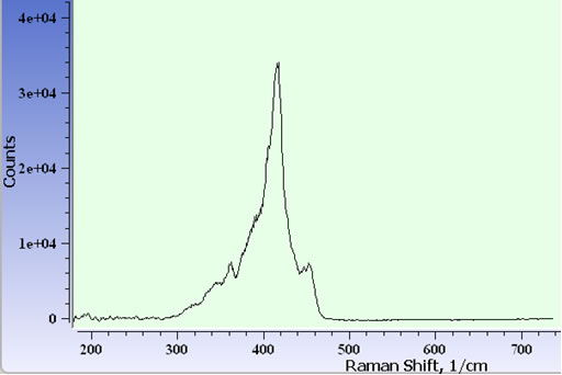 Fig. 2. Raman spectrum of a single nitron fiber demonstrates characteristic peaks in the range of 300...480 cm-1 with maximum at 405 cm-1.