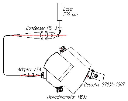 Raman spectra were collected at 90 deg to the exitation beam using a wide-aperture achromatic condenser PS-3, 600 um dia. optical fiber and the M833i spectrometer (1200 l\mm gratings and S7031-1006 Hamamatsu sensor). Aperture matching system AFA consisting of two objectives-achromats was used to match the optical fiber output (NA=0.2) and the M833i input (F# 5.5). The wide-aperture condenser PS-3 consists of a meniscus and two objectives-achromats and provides wide light collecting angle of 37 deg.