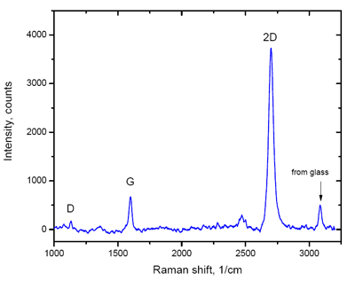 Monolayer graphene film is grown by CVD processing onto copper foil, then transferred onto quartz Properties of Graphene Film on Quartz: The thickness and quality of graphene films is controlled by Raman Spectroscopy The graphene coverage of this product is about 95% The graphene film is continuous, with occasional holes and cracks The graphene film is polycrystalline, i.e. it consists of grains with different crystallographic orientation The transmission of our graphene film is above 97% Sheet Resistance: 660-1,500 Ω/□ Properties of Quartz Substrate: We use G.E. 124 Fused Quartz Substrates Knoop Hardness: >600 Kg/mm2 Density: 2.21 g/cm3 拉曼光谱图 |