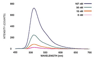圖中所示為納摩爾(nMol)熒光素積聚的熒光輻射情況。我們的實驗使用了一個USB2000-FLG型光譜儀,一個LS-450藍色LED光源,一個CUV-ALL和一個LVF-L低通濾波片將藍色LED限制在<475nm的范圍。我們設置積分時間為100ms。較長的積分時間使系統測量百億分之一摩爾量級的熒光。